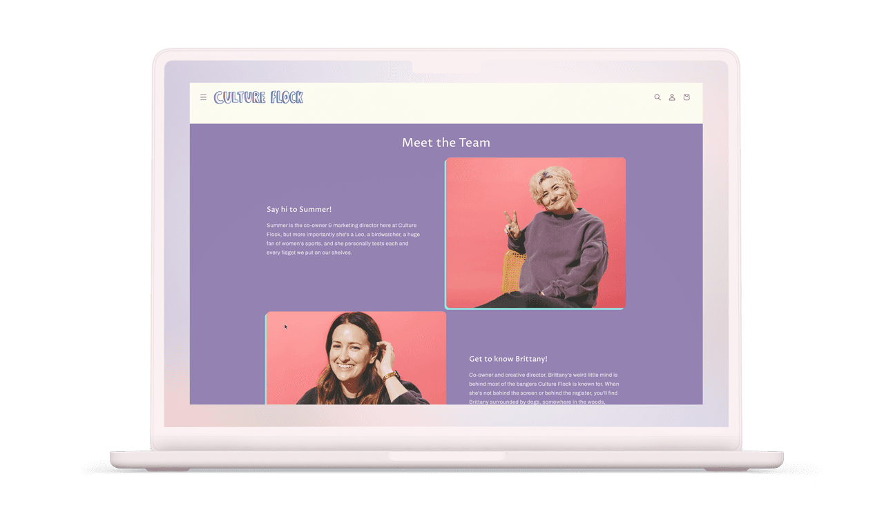 As the brand’s visibility expanded, it became clear that their digital presence needed to catch up with the reality of their in-person experience. They had moved store locations, built new collections, changed their team, got new haircuts, and evolved as humans, but the website and wholesale storefront still reflected an older version of the business. We set out to build a new website that captured their current world — bright, bold, expressive, and unmistakably Culture Flock.